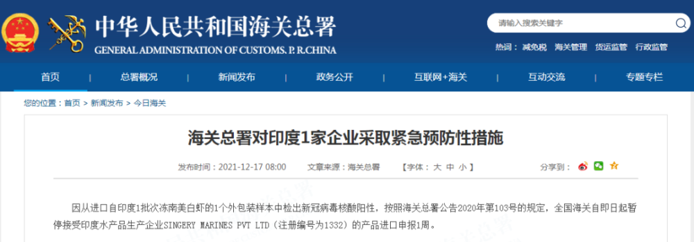 据海关总署网站12月17日消息,因从进口自印度1批次冻南美白虾的1个外包装样本中检出新冠病毒核酸阳性,按照海关总署公告2020年第103号的规定,