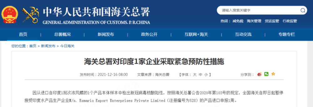据海关总署网站12月16日消息,因从进口自印度1批次冻凤螺的1个产品本体样本中检出新冠病毒核酸阳性,按照海关总署公告2020年第103号的规定,
