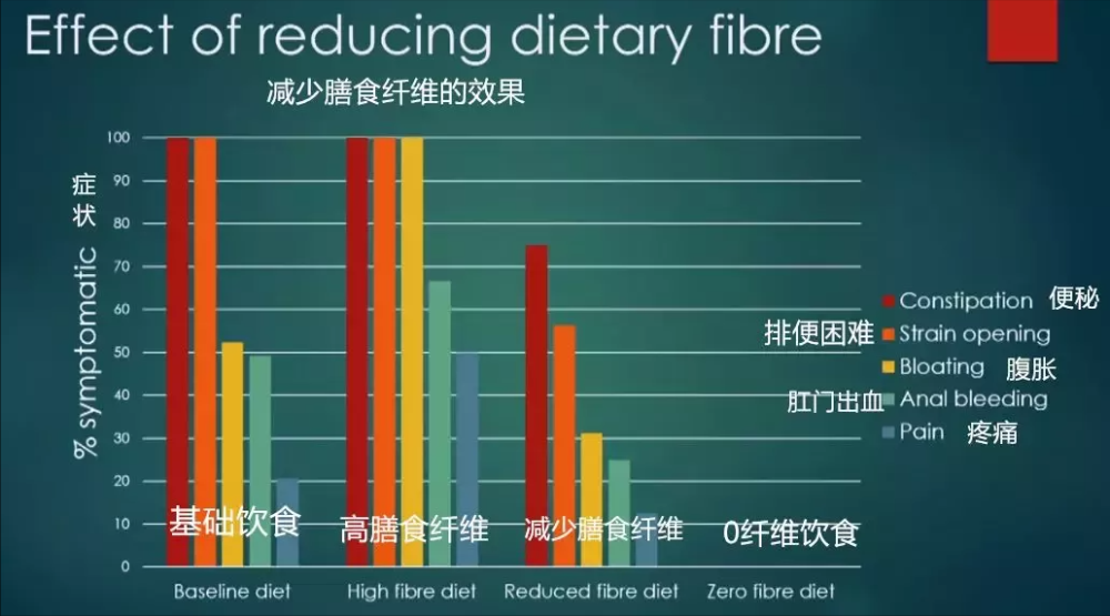 一项研究中,长期受便秘困扰的受试者,在0膳食纤维摄入组中,便秘、腹胀、肛门出血等症状均消失,排便也恢复规律。