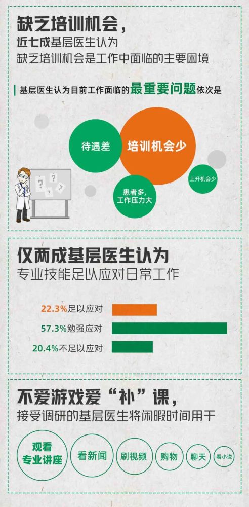 业务培训仍被基层医生认为是日常提高专业技能主要方式,而近七成基层医生认为「缺乏培训机会」是自己工作中的主要困境,位列其后的困境依次是待遇差、患者多、工作压力大和上升机会少。不过归根结底是业务能力不足导致的困境。