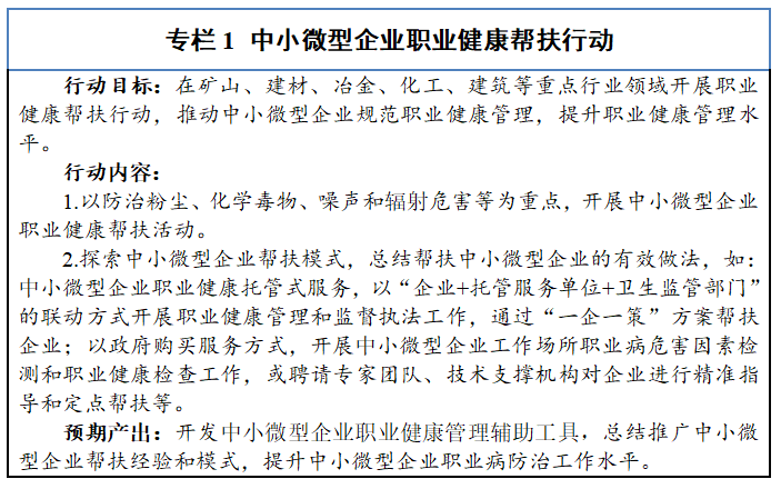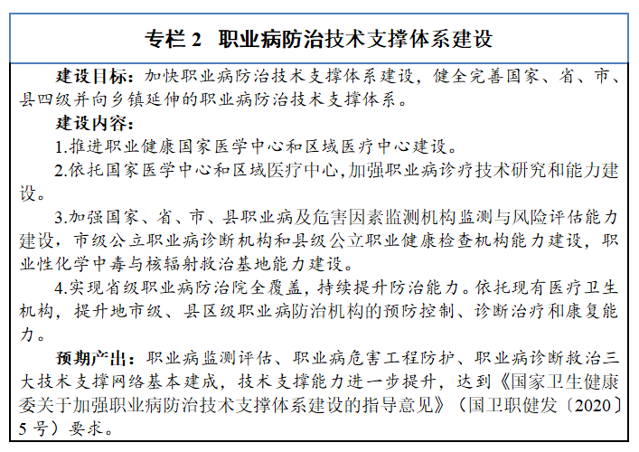 《规划》在主要任务中设置了中小微型企业职业健康帮扶行动、职业病防治技术支撑体系建设、全国职业健康管理信息平台建设和职业健康科技创新等4个专栏。设置这4个专栏,主要是为了解决制约职业病防治工作中的短板与弱项问题,提升职业病防治的服务保障和科技支撑能力。