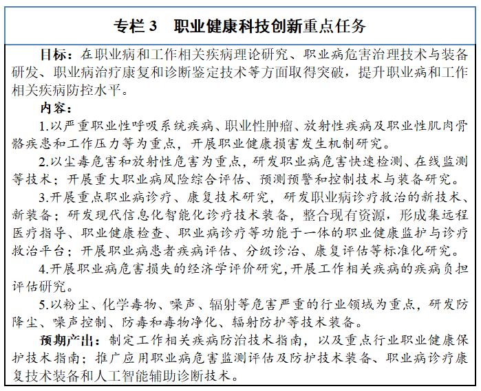六是推动科技创新,引领职业健康高质量发展。推动将职业健康关键技术、重大项目纳入国家和地方科技计划,开展前沿基础性研究、防护关键技术及装备研究、诊疗康复关键技术研究,形成一批先进技术成果并推广应用。