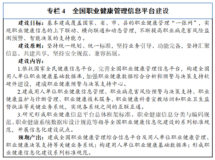 七是推进信息化建设,提升职业健康管理效能。将职业健康信息化工作纳入全民健康保障信息化工程,实现跨层级、跨地域、跨部门的协同管理和服务。建设全国一体化的职业健康信息管理平台,加强部门信息共享。