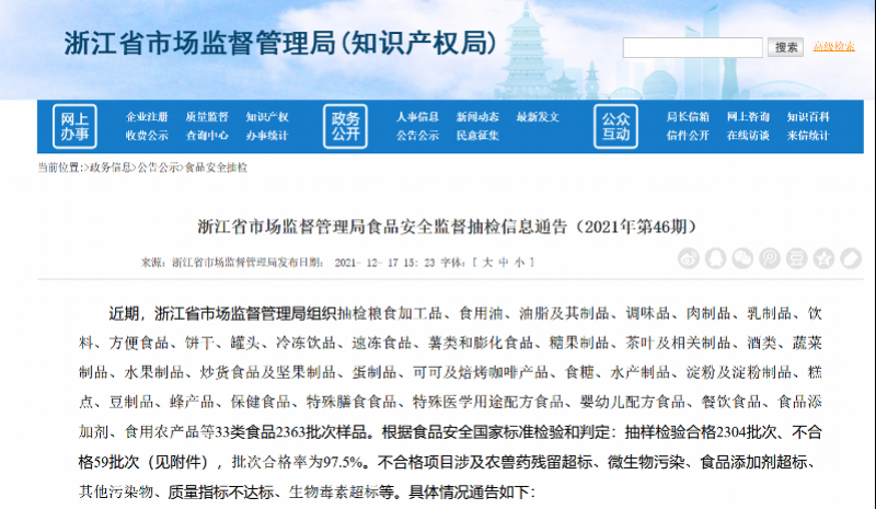 据了解,对抽检中发现的不合格产品,浙江省市场监管局已责成相关市级市场监管部门依法予以查处。要求辖区内各地级市市场监管部门督促食品生产企业查清产品流向、召回不合格产品、分析原因进行整改;督促食品经营环节有关单位立即采取下架等措施控制风险。