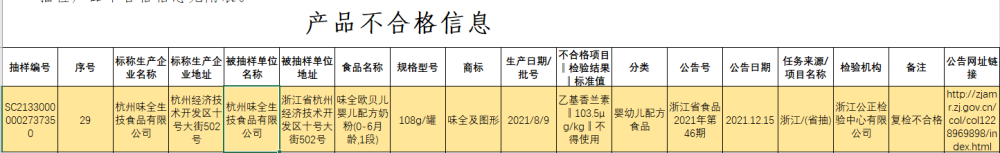产品不合格信息显示,标称生产企业为杭州味全生技食品有限公司的味全欧贝儿婴儿配方奶粉(0-6月龄,1段)被检出乙基香兰素,含量为103.5μg/kg。据了解,乙基香兰素是一种香料,根据《食品安全国家标准 食品添加剂使用标准》(GB 2760-2014),0―6个月的婴幼儿配方食品不得添加任何食品用香料。值得一提的是,该企业申请复检,复检结果仍为不合格。