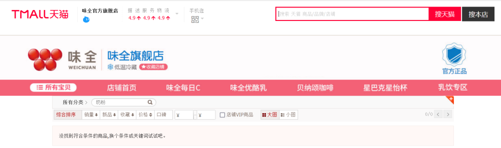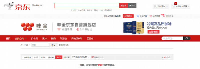 味全官网显示,其线上商城有天猫和京东两家旗舰店。南都记者通过在味全京东自营旗舰店以及天猫味全旗舰店内搜索“奶粉”二字,均未查询到相应结果。