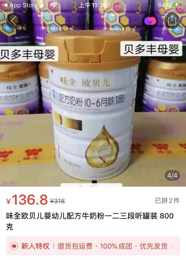 在拼多多上,南都记者发现味全欧贝儿婴儿配方奶粉(0-6月龄,1段)仍有在售。