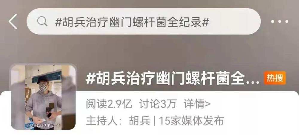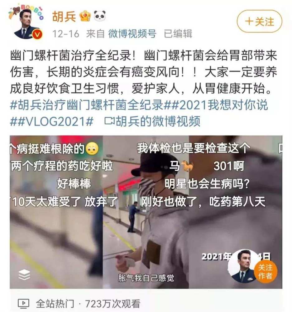 近日,男星胡兵一条关于治疗幽门螺杆菌的vlog记录,冲上了微博热搜。