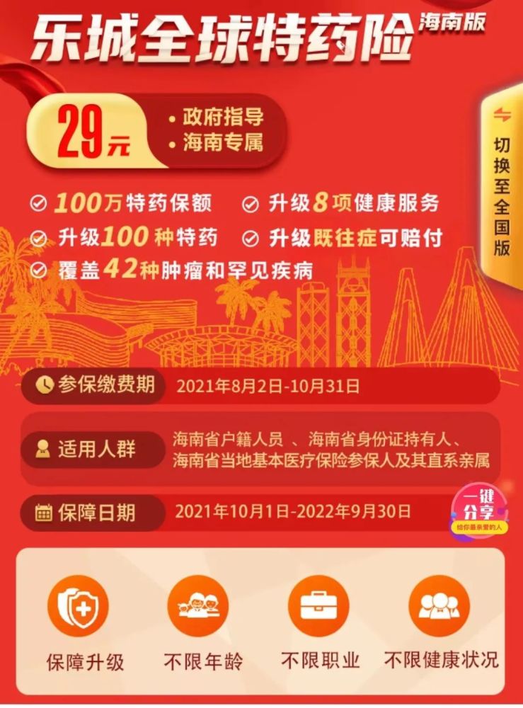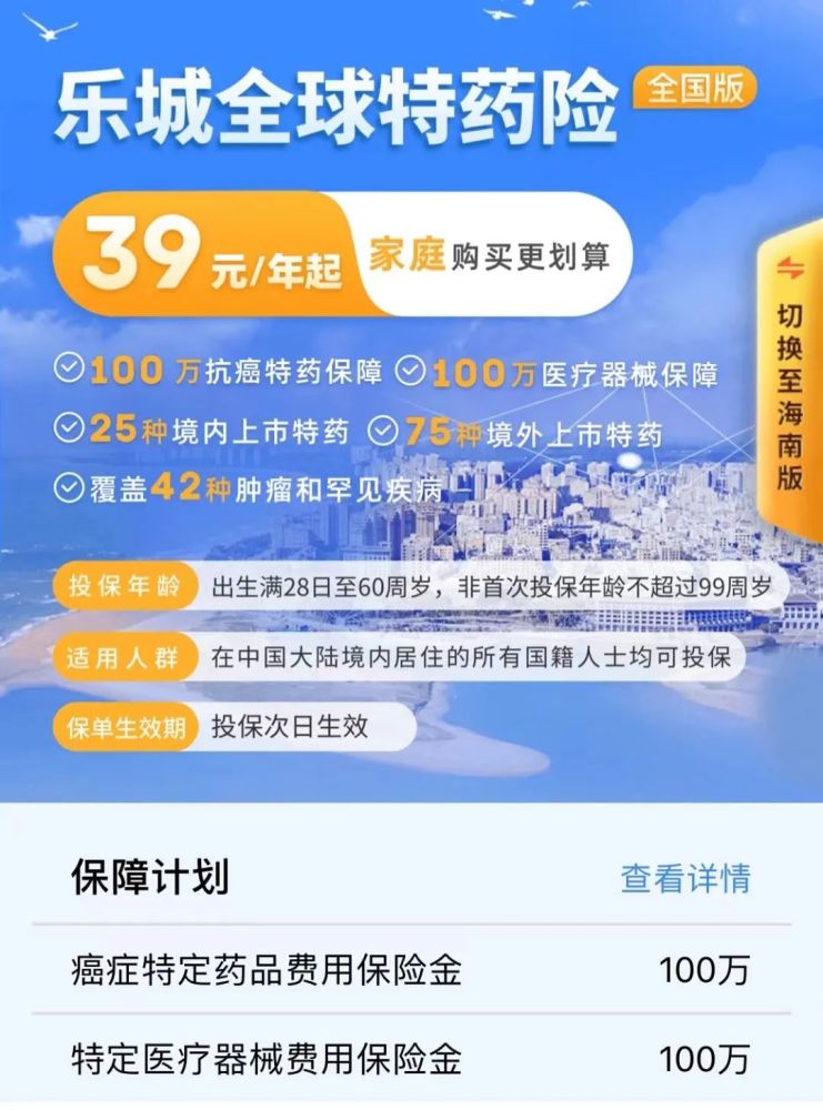 乐城特药险分为海南版和全国版两种。其中,海南版每人每年仅需29元保费,即可享受医保目录外百种海内外高额特药最高100万元的补充医疗保障。全国版按年龄保费不同,最低39元起,最高可获赔200万元。