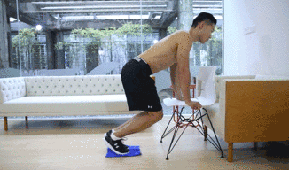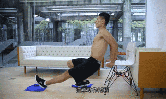 要点:反手支撑在椅子上,双脚分别放在两块毛巾上,收紧腹部核心,交替伸缩腿部,进行前后的滑行训练;注意,动作过程保持自然呼吸,臀部不要下坠;锻炼1分钟的时间