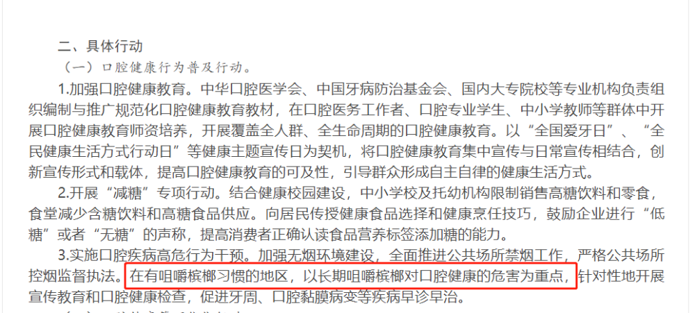 在2019年,国家卫健委就通过《健康口腔行动方案(2019-2025 年)》,要求有咀嚼槟榔习惯的地区,需要加强宣传长期咀嚼槟榔对口腔健康的危害。