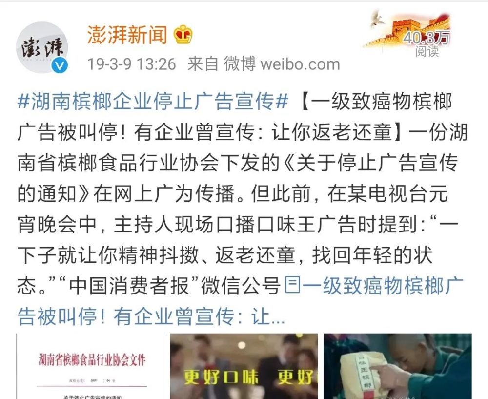 而同年,湖南省槟榔食品行业协会也停止企业广告宣传。