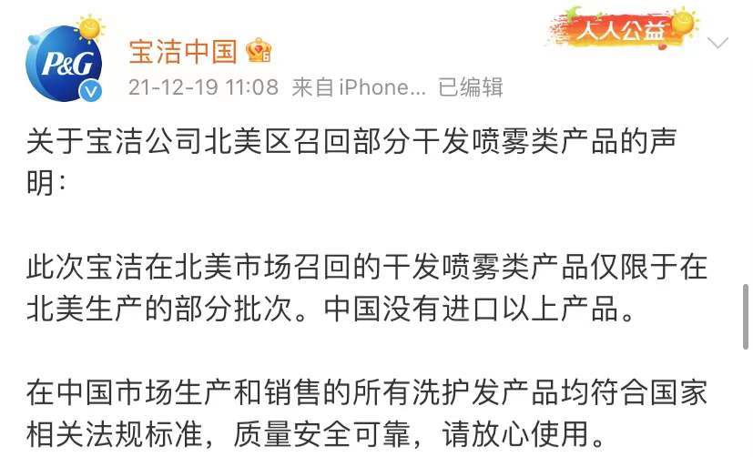 据环球网12月19日报道,当地时间17日,美国的宝洁公司发布官方公告,称在潘婷、Waterless等四种干发喷雾类产品中检测出含有致癌物苯,并非是产品中的成分中含有致癌物,而是产品在喷出之后检测到了苯,目前正在进行产品召回。对此事件,虽目前未发现有因这些产品导致的健康疾病,但是将会威胁健康的产品投入市场,无疑是重大失误,宝洁公司主动进行产品召回,但并未召回中国市场的产品,究竟为何?苯对人体的危害到底有多大?