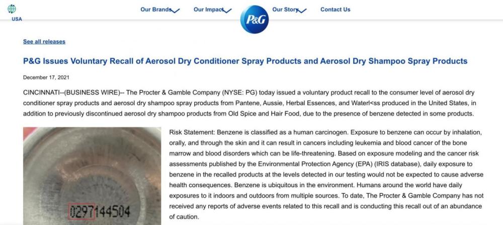 干发喷雾是一种可以不用洗头发的“神奇”产品,一般摇一摇喷在出油的头发上,用梳子或者手简单梳理一下,就可以让头发变得干爽,这是因为干发喷雾中的粉末配方可以吸收油脂,但是这样一种直接接触头皮头发的、粉末香气又会被吸入的产品如今却被检测出含有致癌物。对于这件事,宝洁公司进行回应,目前并没有接收到关于这次召回产品的负面消息,使用产品的顾客每天接触到的苯含量预计不会造成健康威胁。
