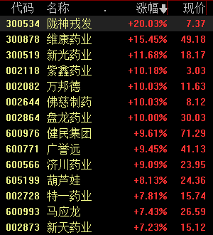 12月20日,中药板块大幅拉升,截至发稿,陇神戎发、紫鑫药业、万邦德等5股涨停,维康药业、新光药业等纷纷跟涨。