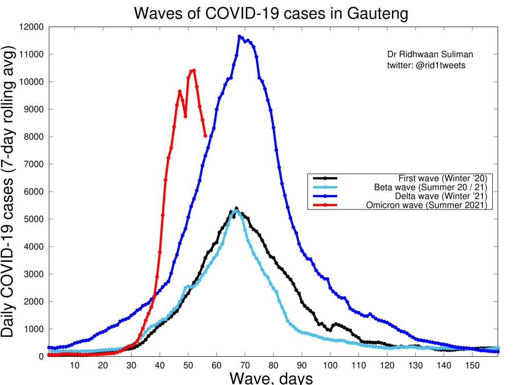 据南非研究机构CSIR的数据,在奥密克戎最先传播,也最严重的南非豪登区,日新增病例在达到10000例峰值之后开始呈下降趋势,该峰值约为德尔塔病毒传播时期峰值的90%,出现拐点的时间较德尔塔时期减少约11天。