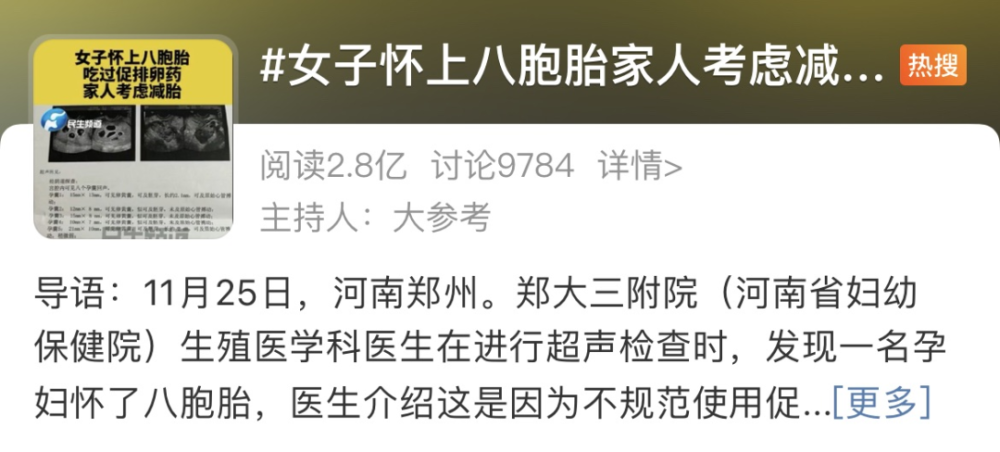 近日,郑州有一女子因为怀上了八胞胎,在网上引发了热议,微博阅读量高达2.8亿。