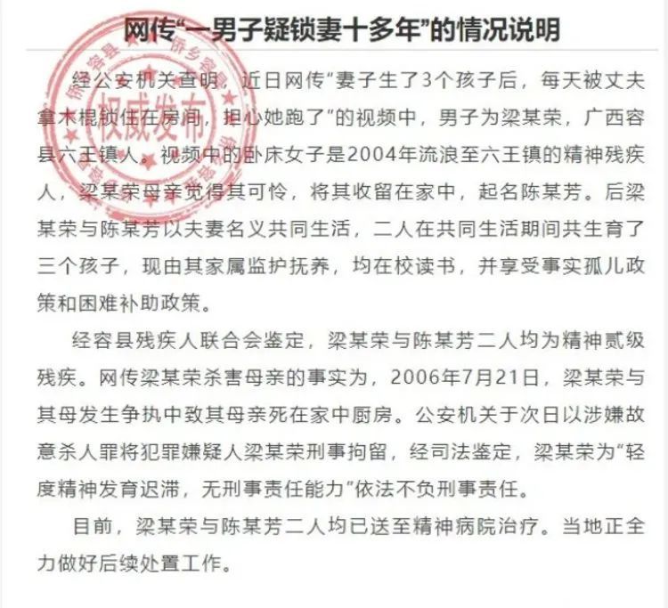 没过多久,当地公安就发出了公告,视频内的内容都是真实的。而这位男子因为“精神发育迟滞”,不用负刑事责任,只是被送往了精神病院。