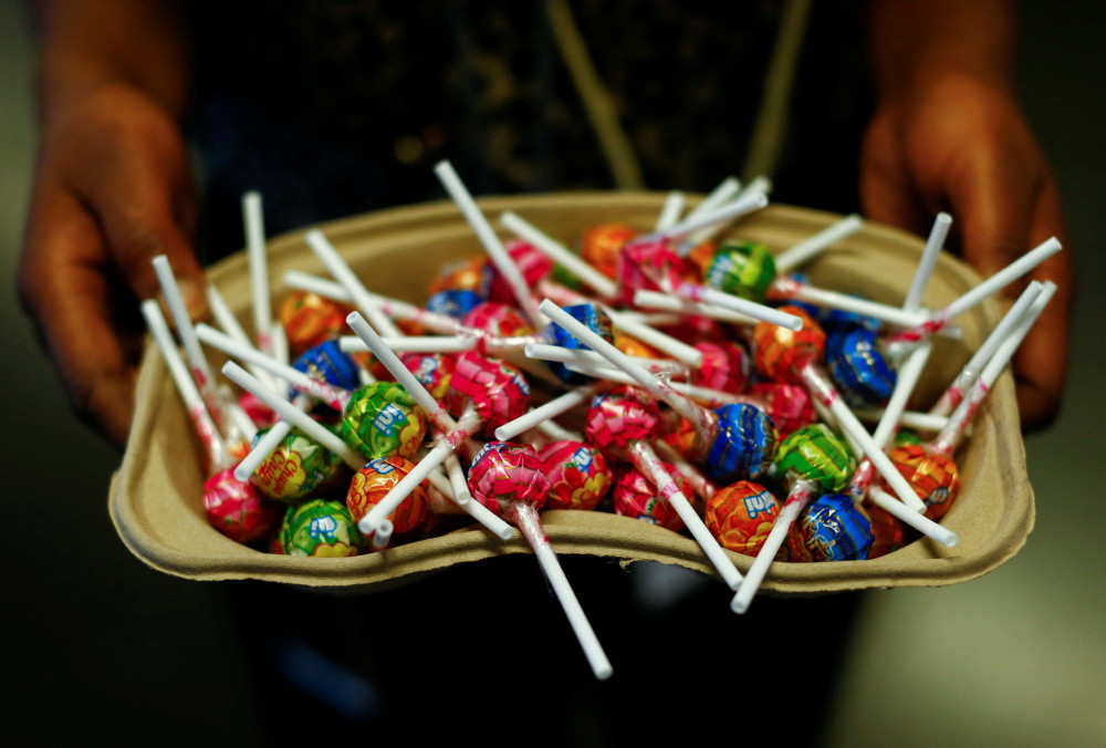 12月18日,在德国科隆一处新冠疫苗接种点,医护人员展示为前来接种的儿童准备的糖果。新华社/路透