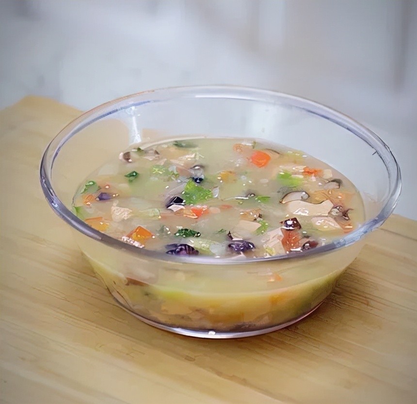 1、三文鱼切小粒,番茄去皮切碎,蘑菇切小片,青菜切碎。