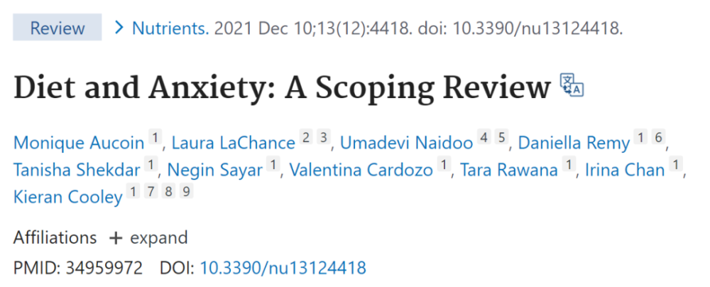 文献索引:Aucoin M, LaChance L, Naidoo U, Remy D, Shekdar T, Sayar N, Cardozo V, Rawana T, Chan I, Cooley K. Diet and Anxiety: A Scoping Review. Nutrients. 2021 Dec 10;13(12):4418. doi: 10.3390/nu13124418. PMID: 34959972.