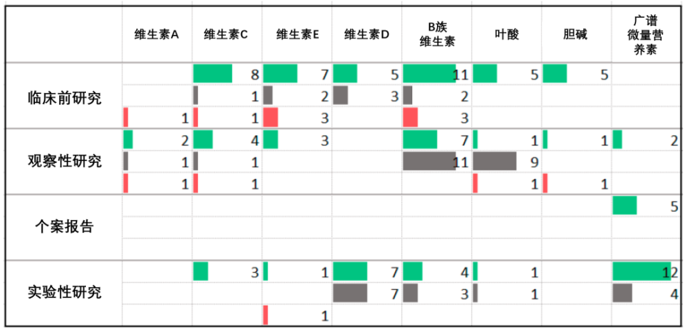 图1 针对维生素与焦虑相关性的研究数量及结果;绿,与焦虑水平更低相关;灰,与焦虑水平无关;红,与焦虑水平更高相关(Aucoin M, et al. 2021)