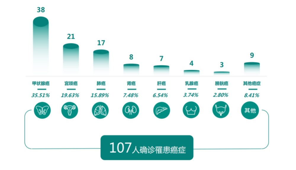 对体检人群进行随访追踪,是目前体检中心较为贴心的管理模式。2020年,爱康集团城市人群癌症随访的统计数据显示:深圳城市人群共107人确诊罹患癌症,其中确诊甲状腺癌的人数最多(38人),往下依次为宫颈癌、肺癌、肾癌、肝癌、乳腺癌、膀胱癌和其他癌种。确诊癌症的最小年龄为23岁,男女各一人,均确诊为甲状腺癌。