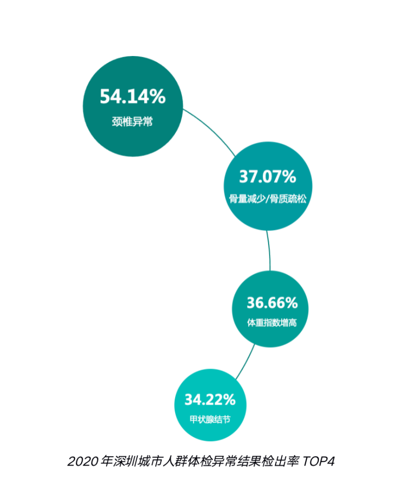 2020年深圳城市人群体检异常结果统计数据显示(排除与性别相关的前列腺异常、乳腺结节、宫颈异常等体检异常结果):颈椎异常的检出率最高,达到54.14%。2020年同年龄区间的女性城市人群颈椎异常的检出率方面,深圳高于全国水平。