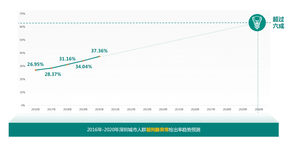 2020年深圳城市人群体检异常结果统计数据显示:前列腺异常检出率高达37.36%,且五年间(2016年-2020年)呈连续上升趋势。在不考虑人口年龄结构、国家卫生政策及其他影响因素变动的情况下,到2030年,前列腺异常检出率预测将超过六成。