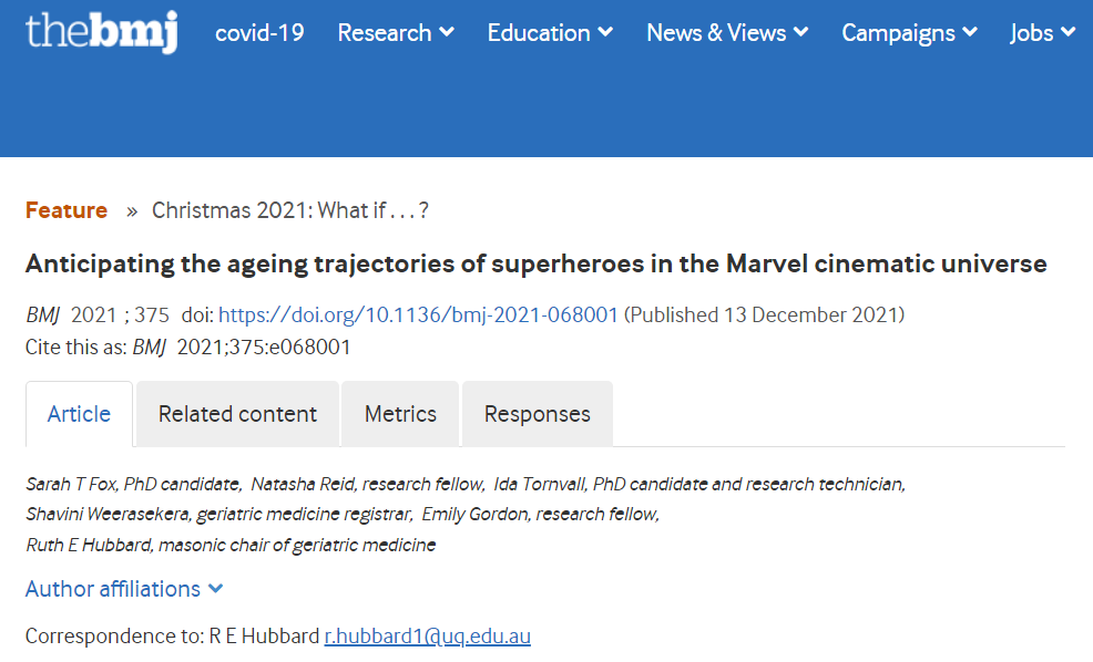相关研究以“Anticipating the ageing trajectories of superheroes in the Marvel cinematic universe”为题,发表在权威医学杂志 BMJ 上。