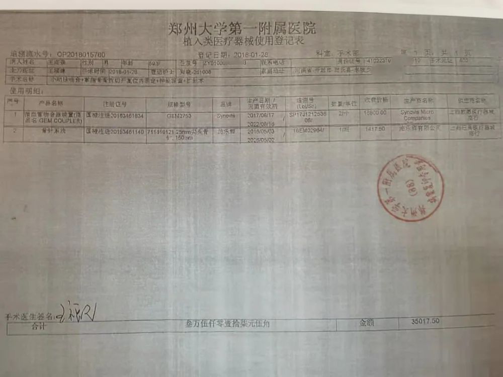 新京报记者调查发现,至少有9名由王福建手术的患者有着与关涛、王海森同样的遭遇。近日,记者先后陪同其中6位患者到郑大一附院调取病历,发现其中4位患者的“植入类医疗器械使用登记表”显示,所使用的为同一产品。另2名患者病历中无登记表。