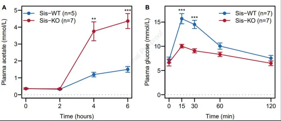 而且,摄入蔗糖后,Sis-KO组体内的醋酸盐明显增多,血糖更低