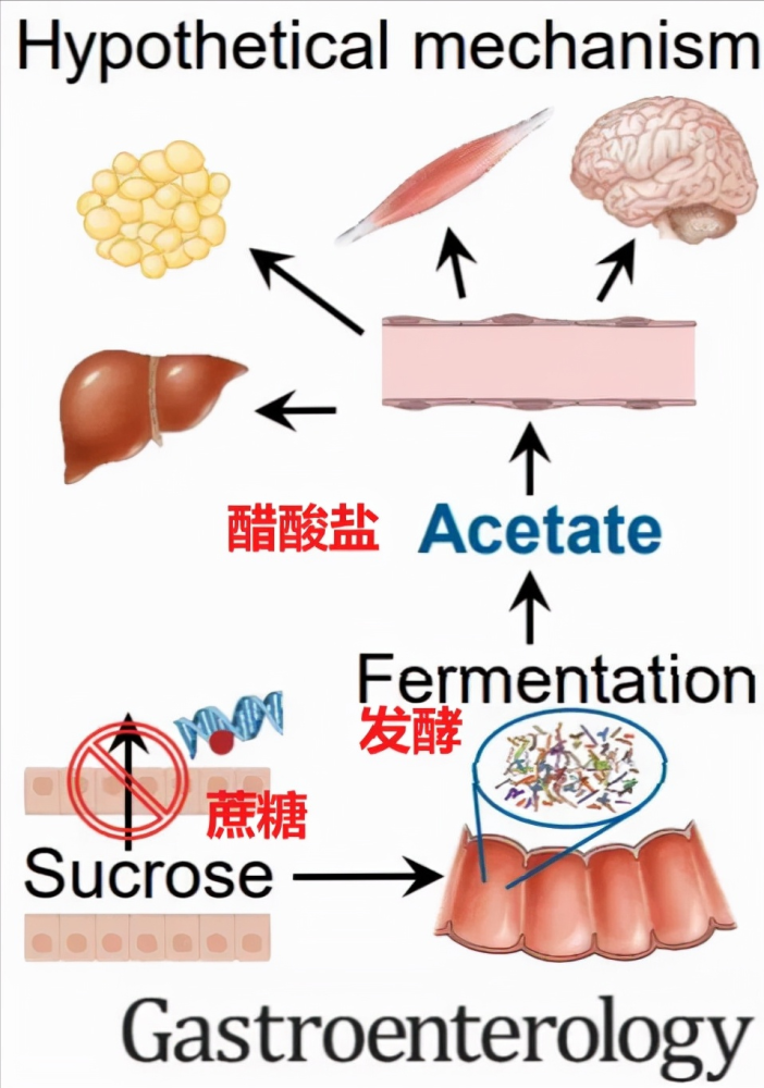 研究人员解释说:这背后的机制很可能是,肠道细菌将糖转化为一种叫做醋酸盐的短链脂肪酸。