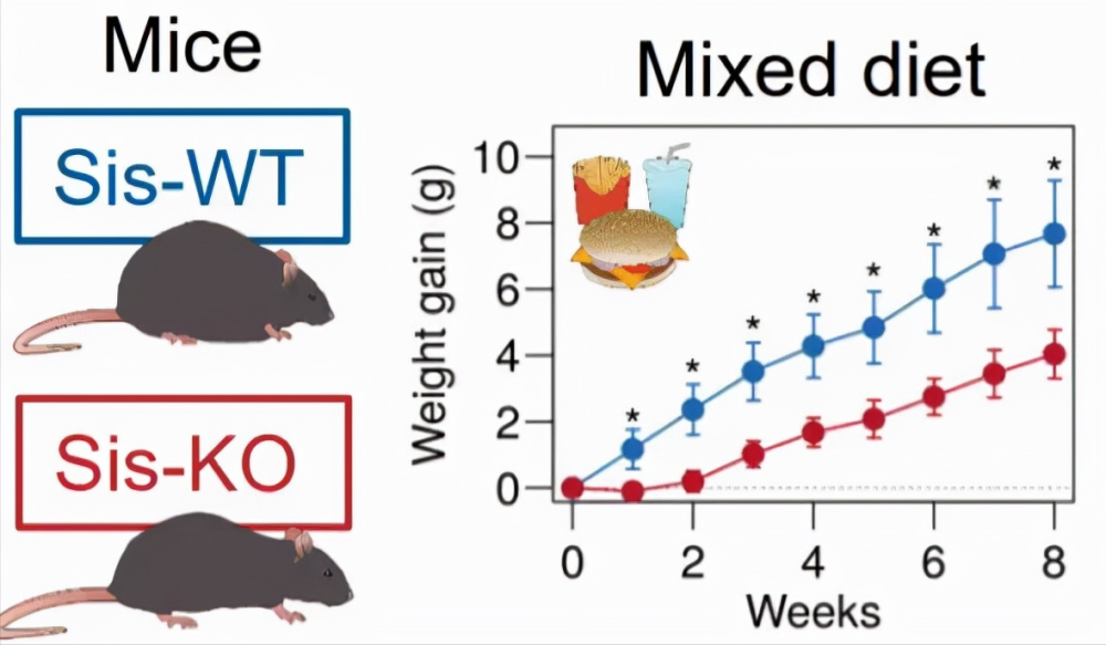 结果发现,吃同样富含糖和脂肪的饮食,Sis-KO组小鼠增加的体重只有Sis-WT组的一半,肝脏甘油三酯水平也更低