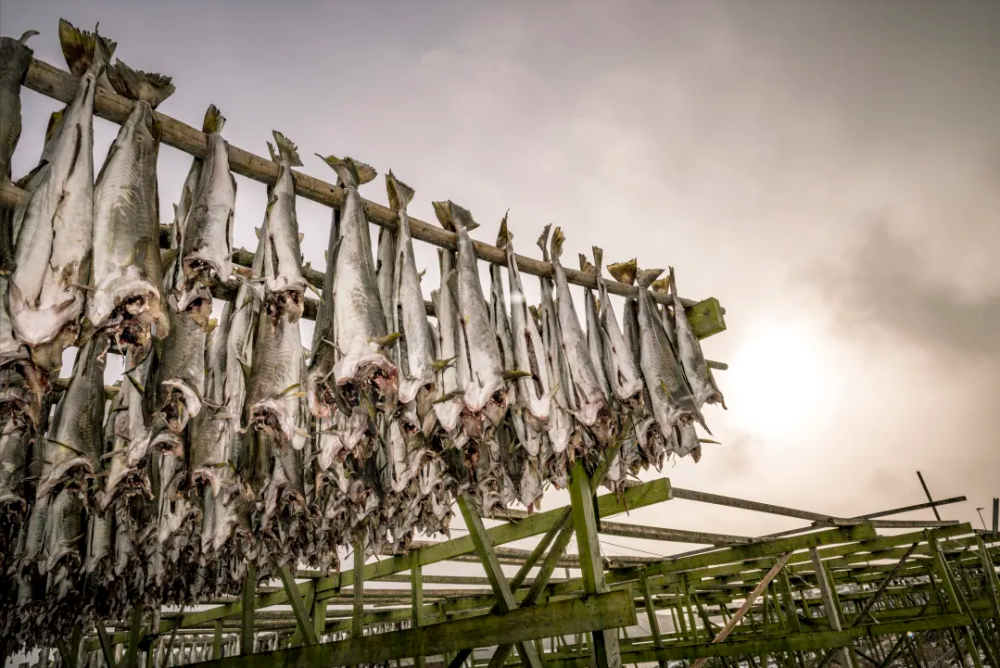 (在冬天寒冷空气中晾干待食的鳕鱼)