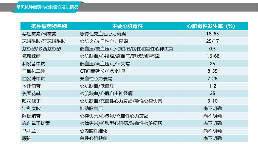 肖教授首先指出肿瘤和心血管疾病都具有基数大和增长快的特点。并且,在肿瘤的诊治过程中,出现心血管系统相关并发症的患者不在少数,肿瘤心脏病学成为最近研究的热点,抗肿瘤药物在杀灭肿瘤细胞的同时,也会引发不良反应,不同的抗肿瘤药物所导致的心脏毒性发生率也有所差异。