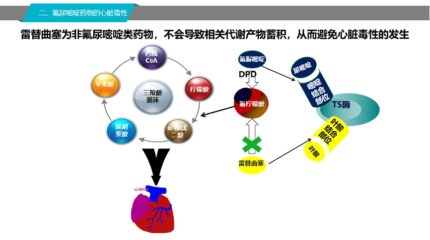 此外,研究表明,既往有心脏病史的患者使用氟尿嘧啶类药物,心脏毒性风险明显升高,且预防性使用硝酸酯类和 CCB 类药物可能无效,因此不建议有既往心脏病史的患者使用嘧啶类似物。而雷替曲塞作为非氟尿嘧啶类药物,不会导致相关代谢产物蓄积,从而避免心脏毒性的发生,对于既往CVD病史或CV风险系数高的晚期结直肠癌患者,雷替曲塞是氟尿嘧啶的安全替代。