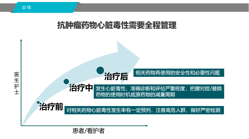 最后,肖教授呼吁针对抗肿瘤药物心脏毒性需要全程管理。治疗前,要对相关药物心脏毒性发生率有一定预判,注意高危人群,做好严密检测;治疗中,发生心脏毒性,要准确诊断和评估严重程度,把握对症/替换药物的使用时机或原药物的减量周期;治疗后,要重视相关药物再使用的安全性和必要性问题。