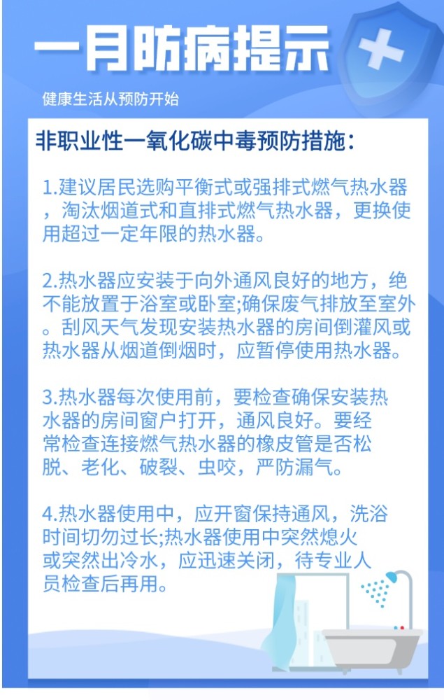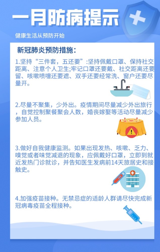 央广网北京1月2日消息 1月正值冬季,天气寒冷,空气干燥,应重点防控新冠肺炎、流感、水痘等呼吸道传染病和病毒感染性腹泻,谨防非职业性一氧化碳中毒事件的发生。此外,高危人群要注意预防心脑血管疾病。健康的生活从预防开始,希望以下的防病小提示可以帮助大家更好的预防这些冬季高发疾病。
