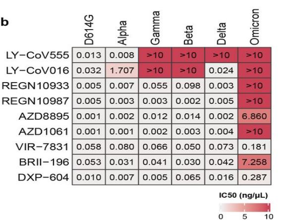 实验表明,针对Omicron,礼来、再生元、阿斯利康的联合单抗都分别呈现出不同程度的失效,只有Vir-7831与DXP-604能抑制Omicron突变株。其中,Vir-7831所在位点属于保守位点,而DXP-604则是由国内药企丹序生物与北大谢晓亮团队共同研发的单抗药物,目前正在国内开展二期临床试验。