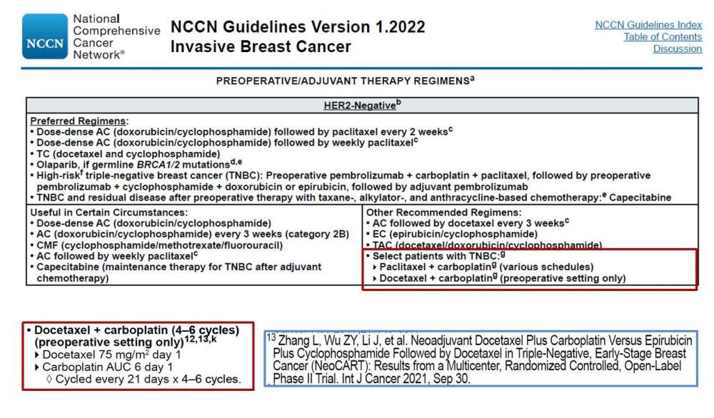 中国医学科研数据进入国际临床指南。近日,作为全球肿瘤治疗主要循证医学依据的NCCN(美国国家癌症综合网),发布了最新版乳腺癌临床实践指南(2022.V1)。广东省人民医院乳腺肿瘤科王坤教授为通讯作者、张刘璐博士为第一作者的针对三阴性乳腺癌新辅助治疗的临床研究成果,被NCCN指南“新辅助/辅助治疗”章节引用,这是我国首个被NCCN乳腺癌临床指南引用的新辅助治疗临床研究。