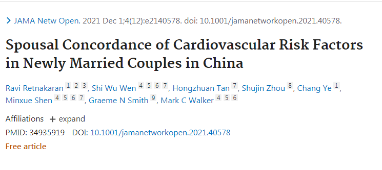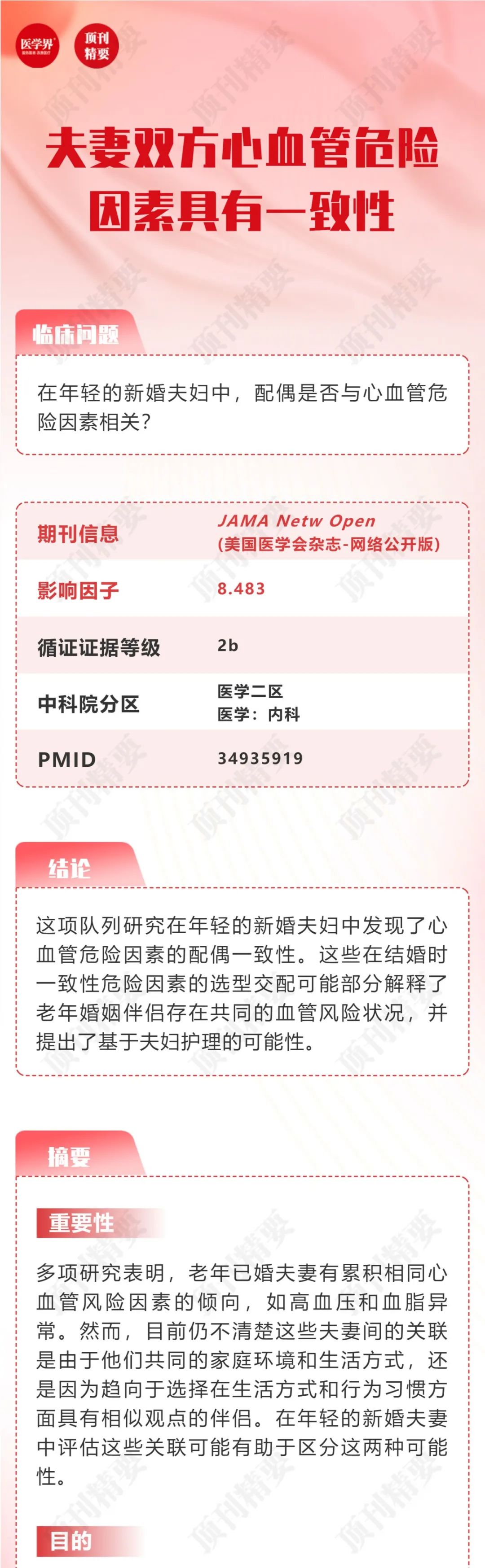 近期,Ravi Retnakaran等人在《美国医学会杂志》子刊――JAMA Netw Open上发表了一篇论文,该研究评估了年轻的新婚夫妇心血管危险因素具有配偶一致性[4]。一起来看看今天的快讯吧!