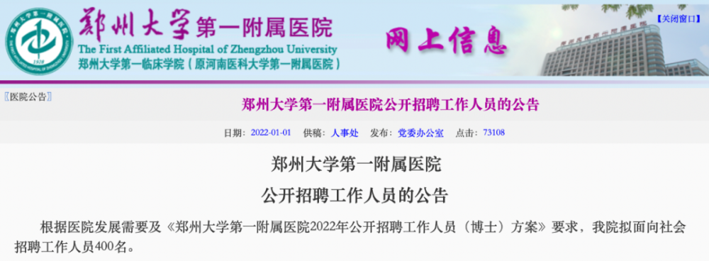 新年第一天,郑州大学第一附属医院发布了《郑州大学第一附属医院2022年公开招聘工作人员(博士)方案》(下称《招聘方案》)。《招聘方案》中除了提及要求博士学位这个硬性指标外,还给前来应聘的博士们提供了优厚的面试条件。