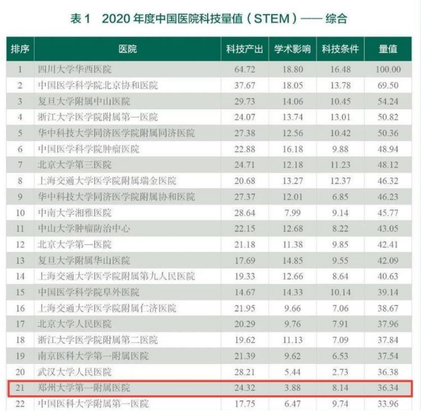 在中国医学科学院医学信息研究所发布的2020年度中国医院科技量值(STEM)综合排名及学科排名中,郑大一附院综合排名提升至第二十一位,较上年进步两名,在榜单列出的31个学科中,郑大一附院有18个学科进入前二十,其中6个学科进入前十。