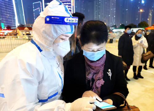 1月10日,在驻马店市西站临时核酸检测点,驻马店市中医院医务人员为旅客采样,并帮助旅客进行手机注册,守护群众健康。 丁宏伟 李 亚 马 勤/摄