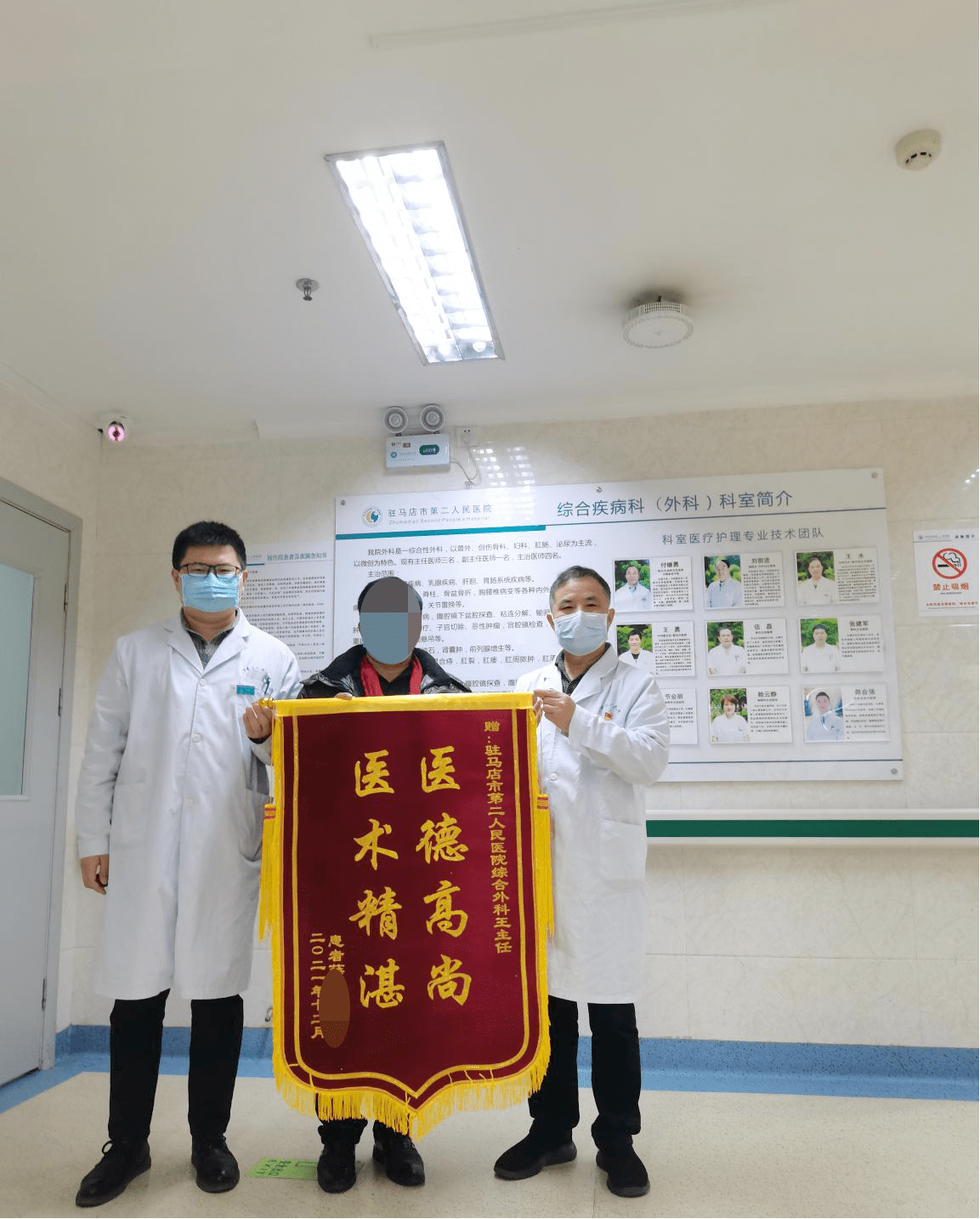 本报讯(记者丁宏伟通讯员李慧)近日,驻马店市第二人民医院综合外科王水主任收到患者薛先生送来的一面锦旗,感谢住院期间综合外科团队的精心治疗与护理。